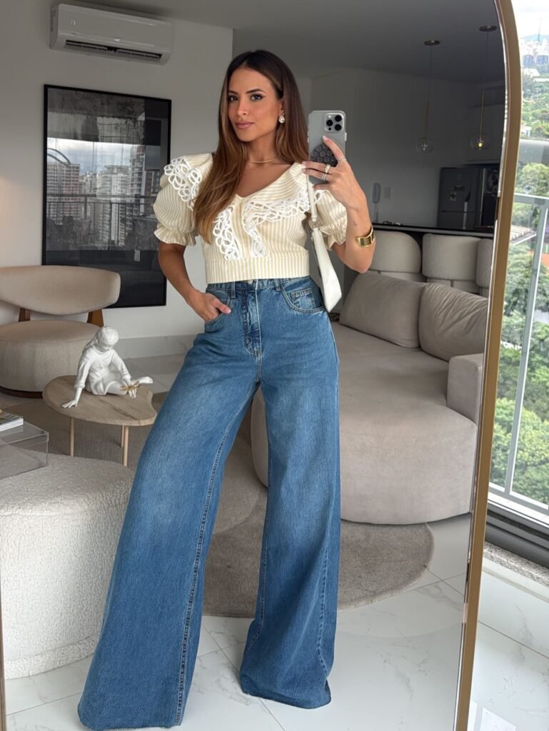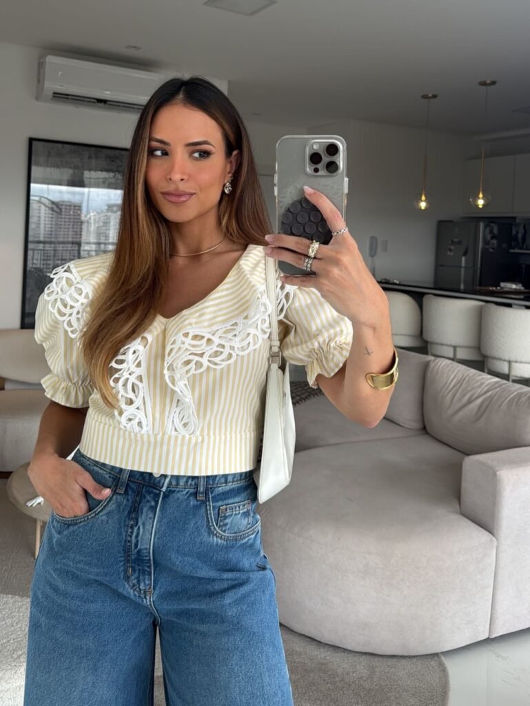 A Blusa Cropped Canelada com Encaje une o tecido canelado com detalhes em renda guipir. Escote com laco e manga bufante criam um look romantico e moderno.