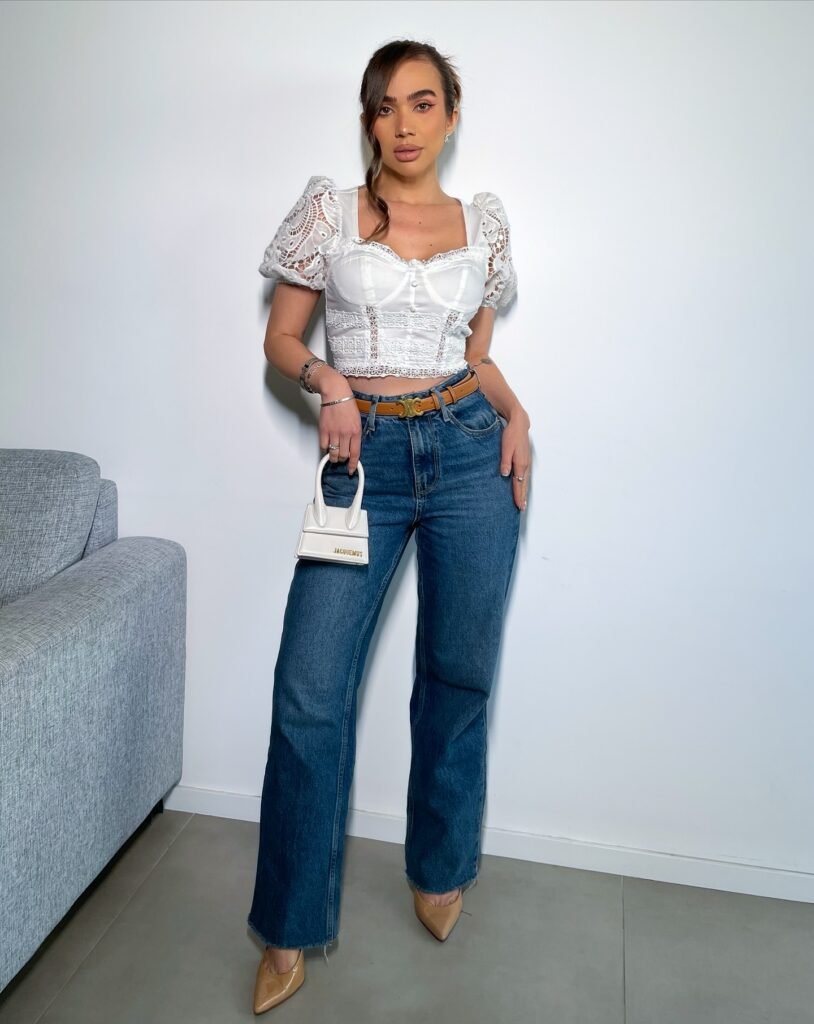 A Blusa Cropped Corselet Laise une o charme do corselet com a delicadeza da laise. Escote coracao, manga bufante e renda que encanta.