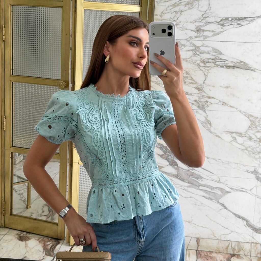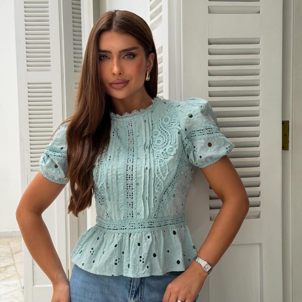 A Blusa Peplum Laise Verde Agua traz frescor e elegancia. Com detalhes em laise vazado, manga bufante e barra peplum que marca a cintura.