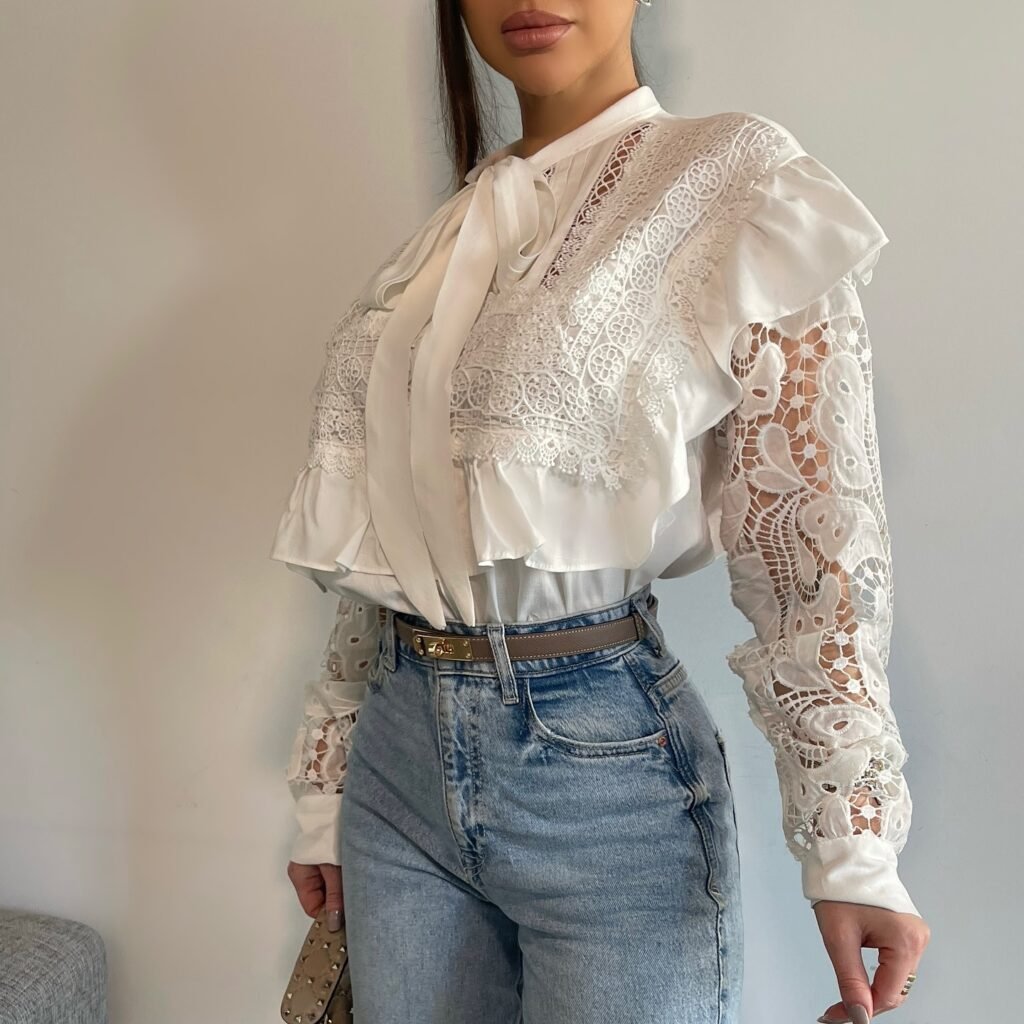 A Camisa Laise com Laco e o maximo da elegancia. Com laco no pescoco, babados no busto e mangas longas em renda vazada.