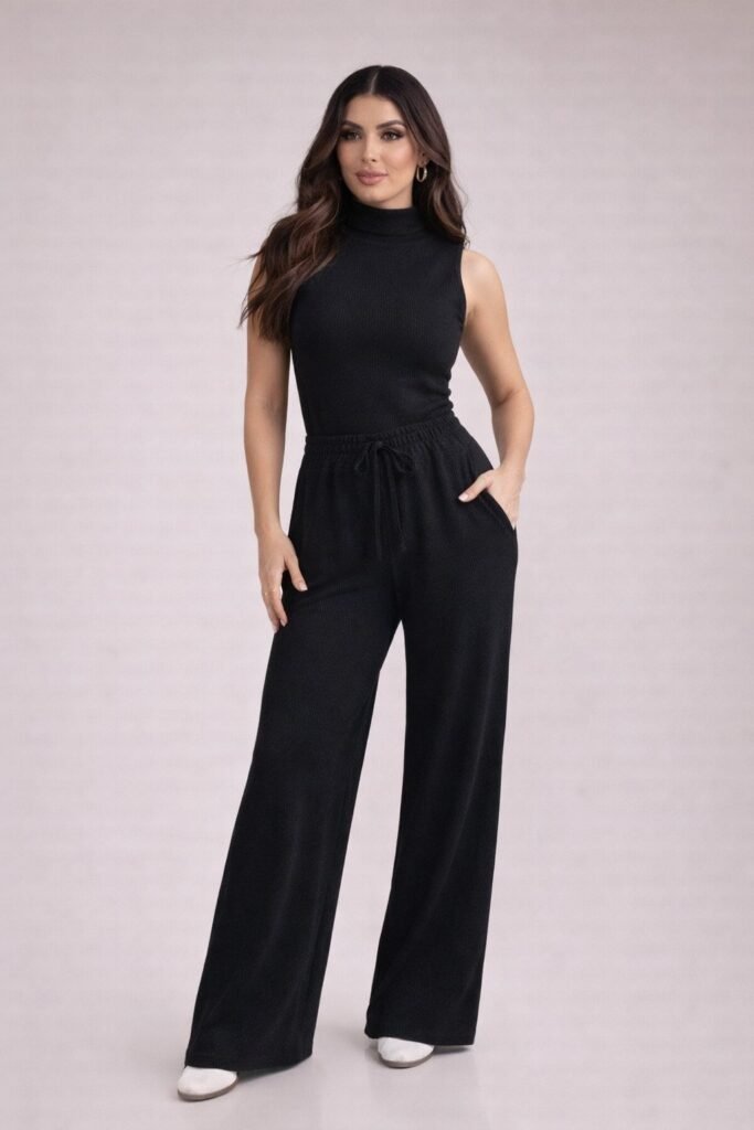 A blusa possui modelagem ajustada com gola alta e design sem mangas, criando um visual moderno e elegante. A calça pantalona complementa o conjunto com cós elástico e amarração frontal, proporcionando ajuste perfeito ao corpo e muito conforto para o dia a dia.