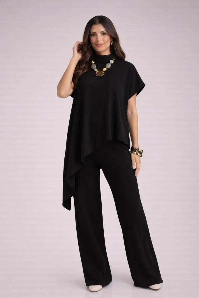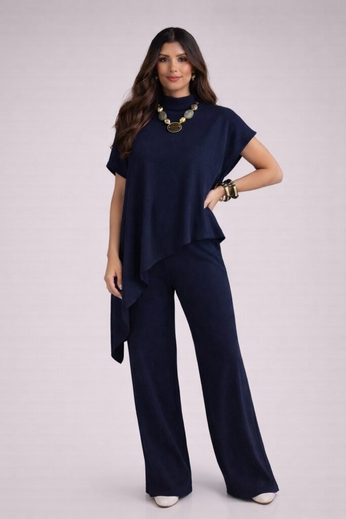 A blusa apresenta modelagem assimétrica moderna, criando um visual elegante e diferenciado. Já a calça pantalona proporciona leveza e alonga a silhueta, trazendo um look sofisticado e confortável para diversas ocasiões.
