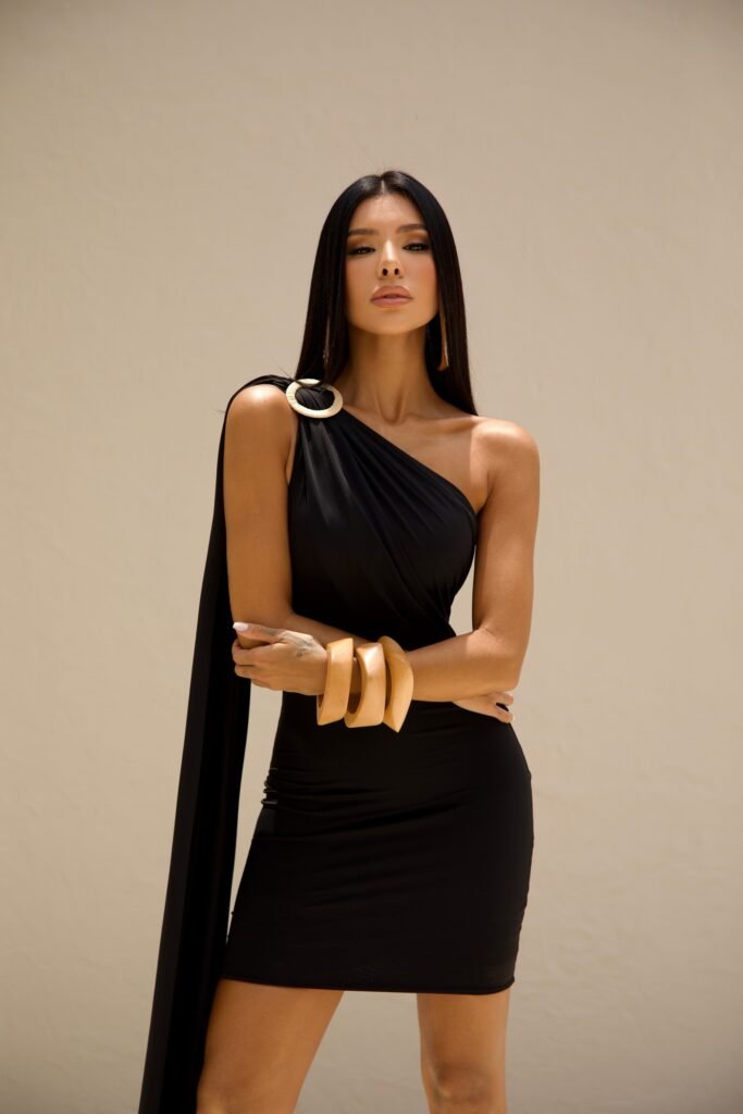O Vestido Curto Exclusivo com Bojo e Caimento Premium possui bojo embutido que valoriza o busto e modela o corpo com elegância.